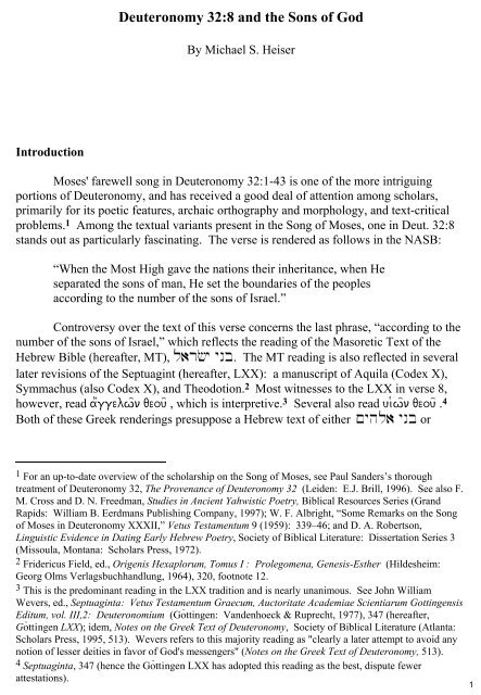 The Deuteronomy 32 Worldview of the Bible Cosmic Geography Posted by MikeHeiser Mar 16 2012 Videos. Heiser Deuteronomy 328-9 and the Old Testament Worldview _ Faithlife Study Bible John D. Heiser Introduction Moses farewell song in Deuteronomy 321-43 is one of the more intriguing portions of Deuteronomy and has received a good deal of attention among scholars.